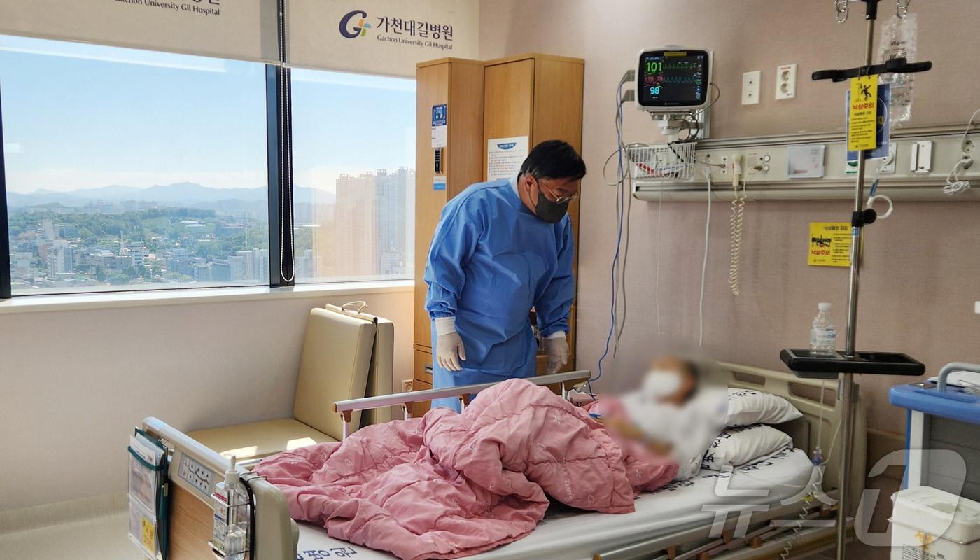 "65세 여성 미만성 거대 B세포 림프종 환자 완전관해 확인"가천대 길병원 혈액내과 이재훈 교수가 CAR-T 치료를 위해 조혈세포이식병동에 입원 중인 림프종 환자 A씨를 살피고 있다. (가천대 길병원 제공) / 뉴스1관련 키워드가천대길병원CAR-T항암치료관련 기사가천대 길병원 암센터, '3년 연속' 전국 1위