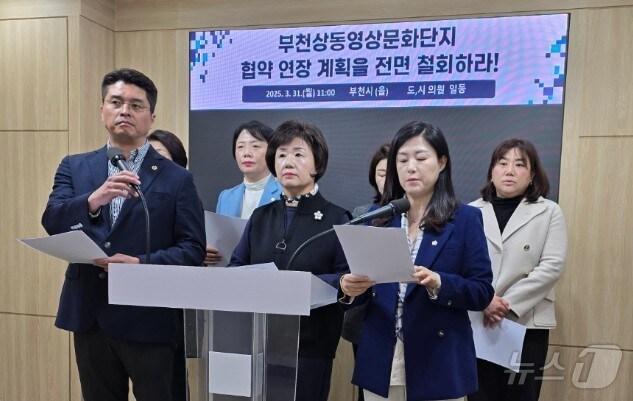 부천시을 지역위 "영상문화단지 협약 연장 전면 철회해야"더불어민주당 부천시을 지역위원회가 31일 부천시청 브리핑룸에서 기자 회견을 하고 있다. 2025.3.31/뉴스1관련 키워드부천더불어민주당상동영상문화단지GS컨소시엄조용익