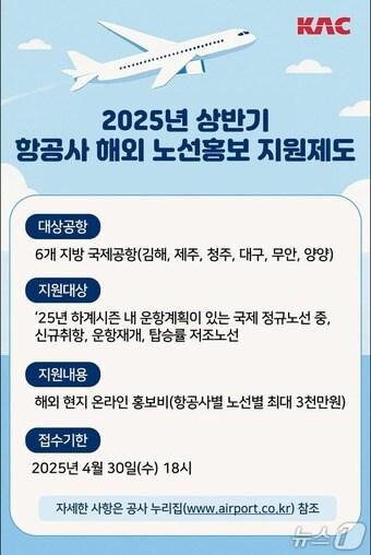 국제선 저탑승·신규노선에 최대 3천만원 지원홍보 포스터(한국공항공사 제공) / 뉴스1관련 키워드한국공항공사공항해외노선홍보관련 기사백화점 '큰 손' 바뀌나…외국인 매출 '실적 변수' 자리매김"부장님! 저 2월에 없어요"…미리 보는 새해 월별 '연차 명당'대구시 "대구공항 국제선 늘려야"…항공사 지원 강화외국인 한국 여행, 한 장의 카드로…'코레일패스 플러스' 출시[2025결산-관광]1.68초마다 "헬로 코리아"…방한객 1900만 고지 밟는다