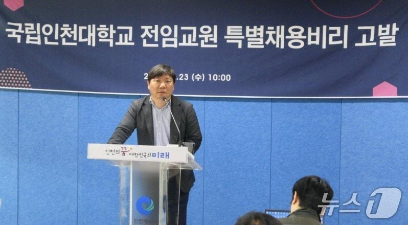 박승진 교수 "자격 기준 삭제, 총장 승인으로 임용"인천대 "교육부·권익위 감사서도 문제없음 판명"박승진 인천대(도시공학과) 교수가 23일 인천시청 브리핑룸에서 기자회견을 열고 있다. 2025.4.23/뉴스1관련 키워드인천대채용임용불법특별채용인천대학교총장관련 기사유승민 딸 유담 '교수 특혜' 사건 반부패수사대에 배당유승민 딸 '아빠찬스' 있었나…경찰, 임용 특혜 고발장 접수조국 "유승민·한동훈·나경원 자녀는 공정한가" 연일 저격여야, 교육위 국감서 '서울대 시진핑 자료실·유담 임용' 설전(종합)진선미, 유승민 딸 교수 임용에 "이런 무경력은 처음 본다"