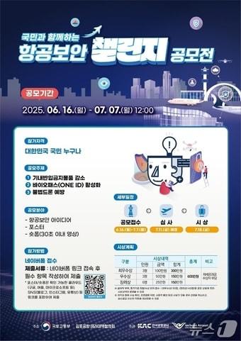 7월7일까지 아이디어·포스터·숏폼 접수항공보안 챌린지 공모전 포스터(한국공항공사 제공. 재판매 및 DB금지) /뉴스1 )관련 키워드한국공항공사보안챌린지공모전관련 기사인천공항공사, '2025년 공공 AI 대전환 챌린지 왕중왕전'서 대상