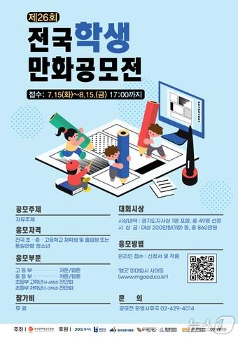 8월 15일까지 접수…자유 주제로 창의력 발휘 기회 제공전국학생만화공모전 홍보 포스터(한국만화영상진흥원 제공. 재판매 및 DB금지) / 뉴스1관련 키워드한국만화영상진흥원만화공모전관련 기사'마루는강쥐' 팝업에 110만원 구매자 등장…韓 웹툰 한자리'윤석열 얼굴' 열차, 조종석에는 김건희…예술고교생의 기막힌 3년 전 예언?LG헬로비전, 바른 AI·디지털 생활 공모전 시상…"올바른 AI활용"그림일기·웹툰으로 디지털윤리 인식제고…방통위, 공모전 개최"허락 없는 합성은 안 돼"…LG헬로비전, 서울 청소년에 가르친다