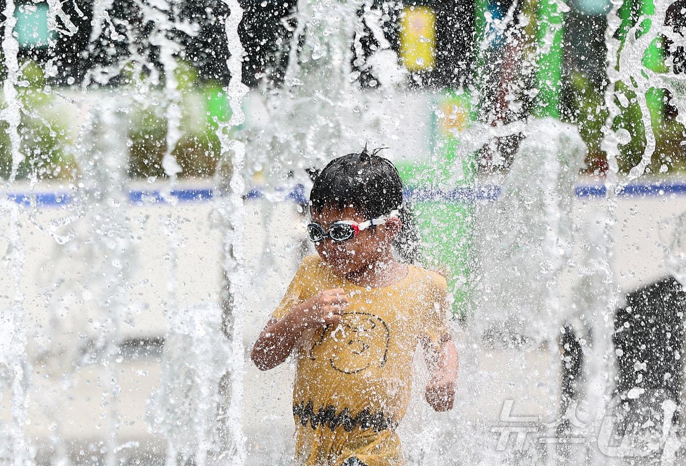 무더위가 이어진 4일 서울 종로구 광화문 광장을 찾은 어린이가 바닥분수에서 더위를 식히고 있다. 2025.7.4/뉴스1 ⓒ News1 김도우 기자