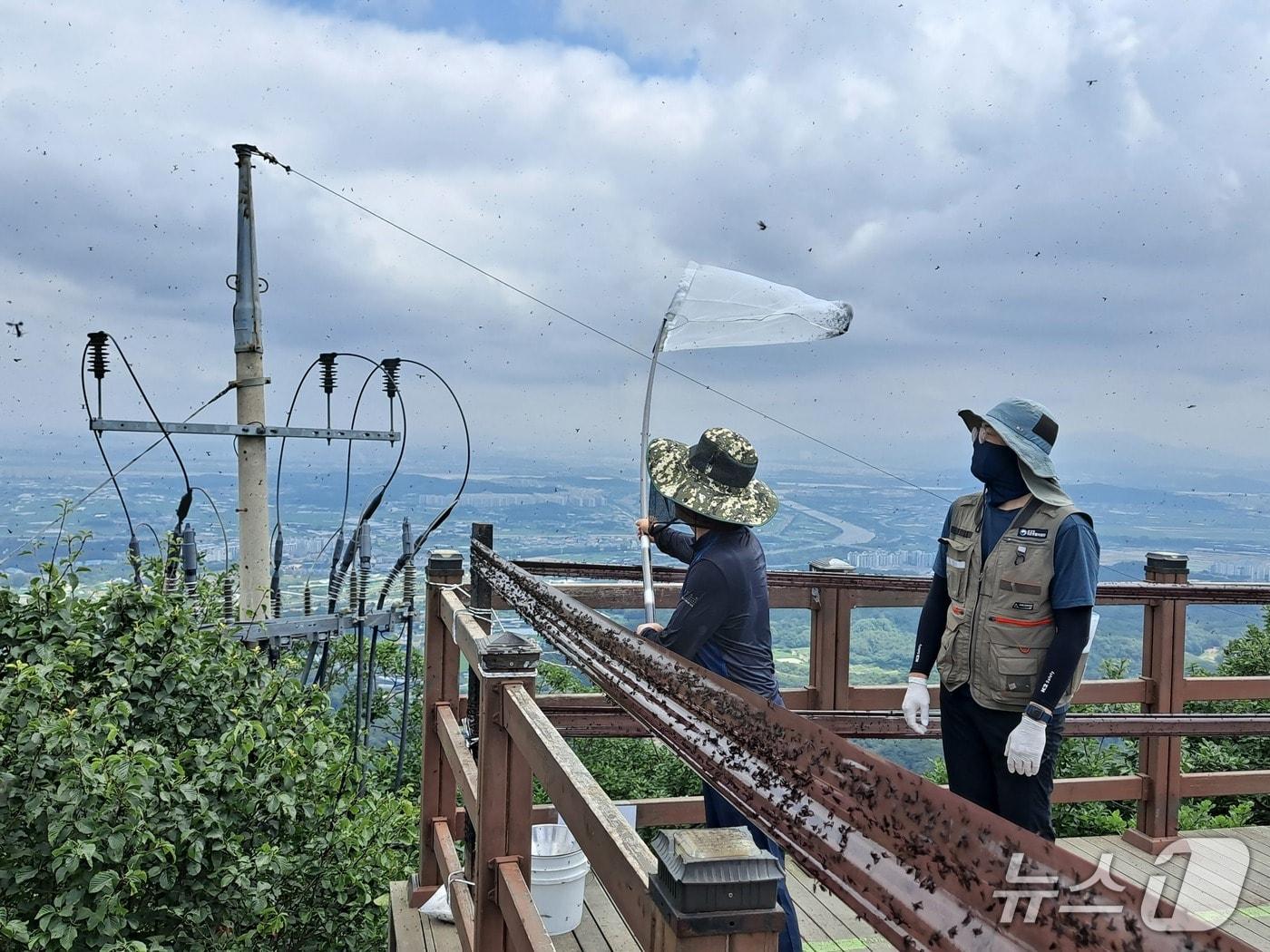 유정복 시장이 포충망으로 방제활동하는 모습(인천시 제공) / 뉴스1