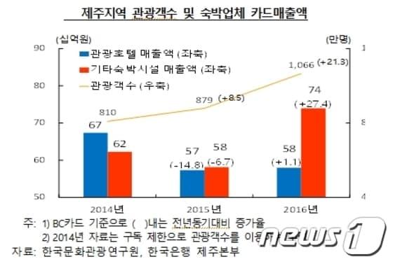 제주지역 관광객수 및 숙박업체 카드매출액. (한국은행 제주본부 제공) 2016.11.28/뉴스1 ⓒ News1