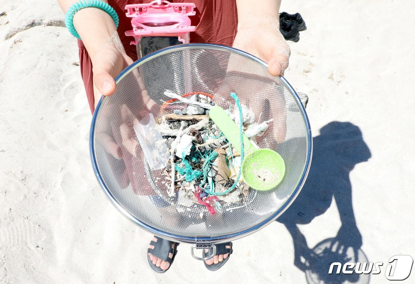 지난 8월15일 제주 함덕해수욕장에서 진행된 '플라스틱 없는 제주-우리가 버린 미세플라스틱 수거 캠페인' 행사에서 참가자들이 채반을 이용해 플라스틱을 걸러내고 있다.2020.8.15/뉴스1 ⓒ News1 오현지 기자