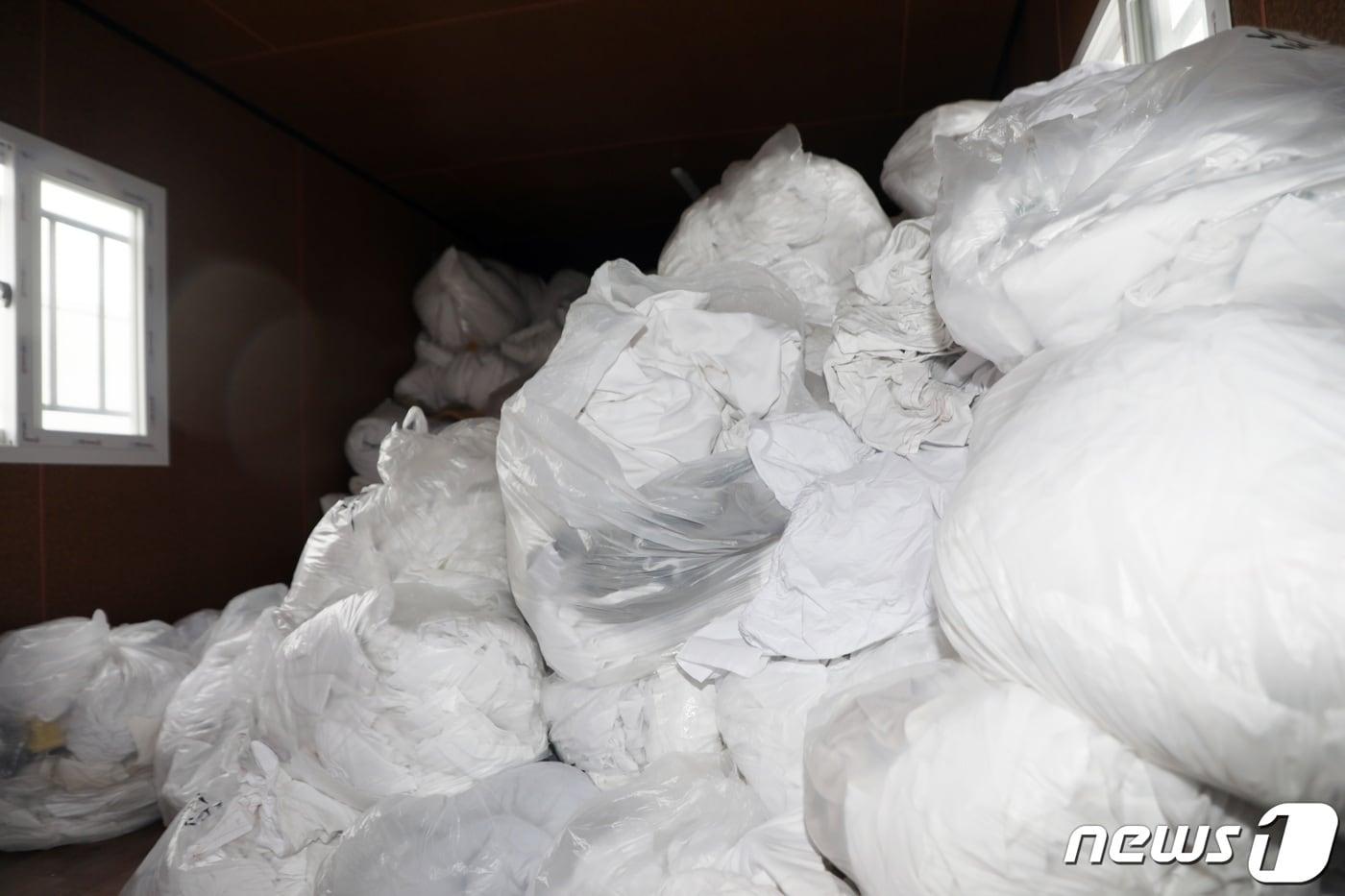 폐침구 재활용업체 제클린 창고에 쌓인 폐침구들