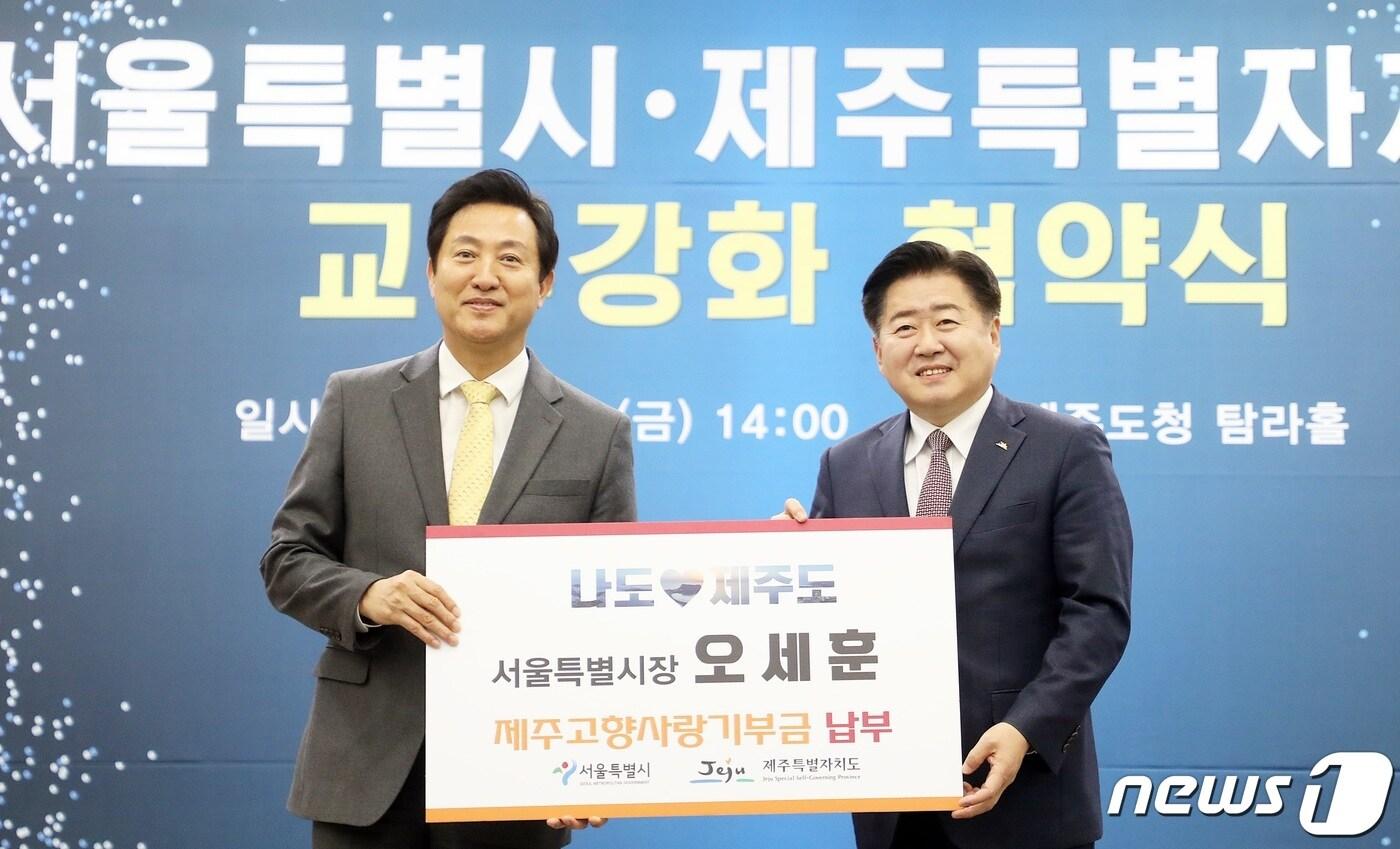 제주도는 오는 5일 오전 10시 제주도의회 의원회관 대회의실에서 '제주 고향사랑기부제 활성화 방안 마련을 위한 정책토론회'를 연다고 4일 밝혔다. 오세훈 서울시장이 지난 2월 제주도청 4층 탐라홀에서 오영훈 제주지사에게 고향사랑기부금을 전달한 뒤 기념촬영을 하고 있다. 이날 오 시장과 오 지사는 서울시와 제주도 간 지역상생 협력체계 구축을 위한 협약을 맺었다. 2023.2.3/뉴스1 ⓒ News1 고동명 기자