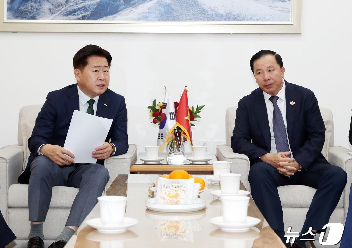 오영훈 지사와 응우옌 반 웃(Mr. Nguyen Van Ut) 베트남 롱안성 인민위원장 겸 당 부서기가 23일 제주도청에서 만나 양 지역의 교류협력 강화방안을 모색하고 있다.(제주도청 제공)/뉴스1