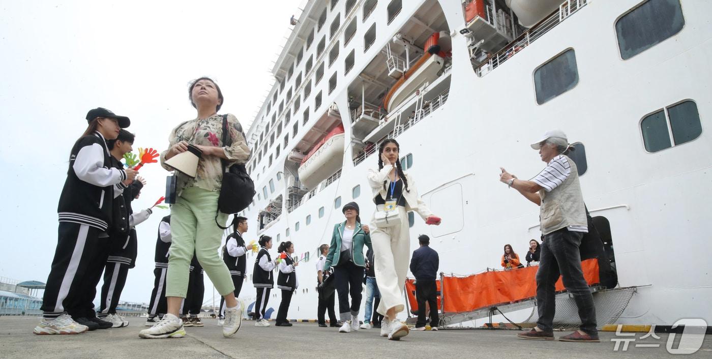 중국 노동절 연휴를 앞둔 30일 오전 제주항에 입항한 크루즈 '드림호'를 타고 제주를 찾은 중국인 단체 관광객들이 하선하고 있다. 제주 관광업계는 다음달 1일부터 6일까지 5일간 중국인 약 2만2600여 명이 제주를 찾을 것으로 보고 있다. 2024.4.30/뉴스1 ⓒ News1 오현지 기자