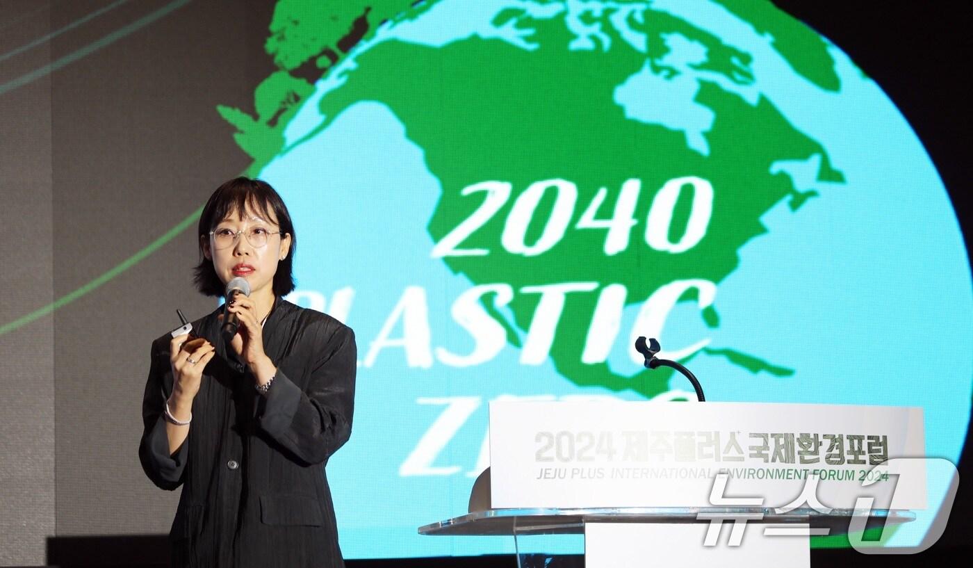 오정화 아모레퍼시픽 지속가능경영센터 상무가 27일 제주 서귀포시 제주부영호텔리조트에서 열린 2024 제주플러스 국제환경포럼 제5세션에서 아모레퍼시픽의 탈플라스틱 사업을 소개하고 있다.2024.9.27/뉴스1 ⓒ News1 고동명 기자