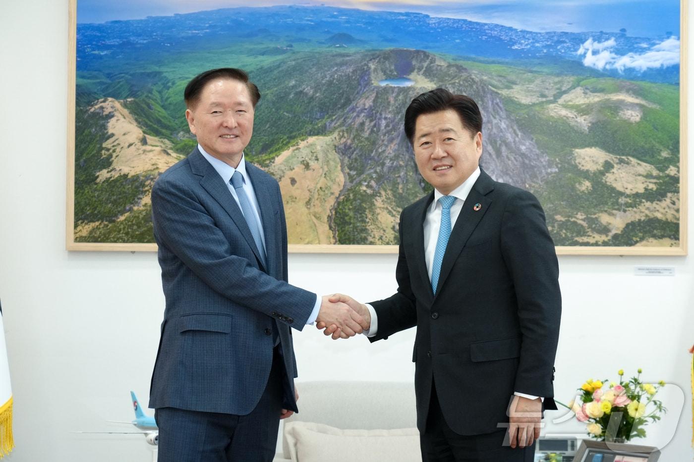 오영훈 지사 "제주 관광객 10.7% 감소, 노선 확장 필요"한진그룹 지하수 취수량 증산 문제 추후 법적 논의 전망오영훈 제주지시와 우기홍 대한항공 대표이사 부회장이 17일 오후 제주도청 집무실에서 면담 후 기념촬영을 하고 있다.(제주도 제공. 재판매 및 DB 금지)관련 키워드제주대한항공관련 기사항공업계 4분기 실적도 '흐림'…고환율에 공급석 규제까지 '발목'"제주항공 참사 여객기 엔진 결함 가능성도 조사"12·29여객기참사 유가족 "항철위 이관 환영…이제부터 시작"섬에어, 1호기 도입 "항공 소외 지역 취항, 지방공항 활성화 앞장"전진숙 의원 "로컬라이저·둔덕은 장애물…정보 미제공은 위법"