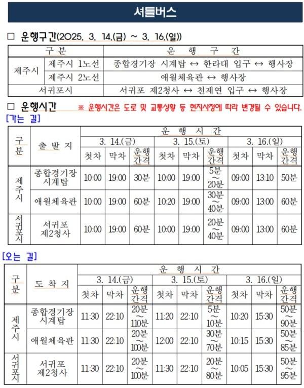 제주시 종합경기장·애월체육관, 서귀포시 시청 2청사서 출발2025 제주들불축제 셔틀버스 운행 시간표(제주시 제공, 재판매 및 DB 금지)/뉴스1 관련 키워드제주 축제행사강승남 기자 인공지능·디지털 맞춤형 교육…제주교육청, 연구·선도학교 50곳 선정"카지노 게임 조작" 제주 카지노서 폭행한 중국인 3명 집유 구형관련 기사서귀포시, 불꽃쇼 등 야간관광 콘텐츠 확대제주도, '용천수 인증마을' 2곳 선정…5400만원 지원제주들불축제서 사라졌던 '불' 부활…오름 대신 '달집태우기'[뉴스1 PICK]병오년 새해 첫날... 강추위에도 '알몸으로 뛰어!'"새해 건강·행복 가득하길"…한라산·성산일출봉서 2.2만여명 몰려