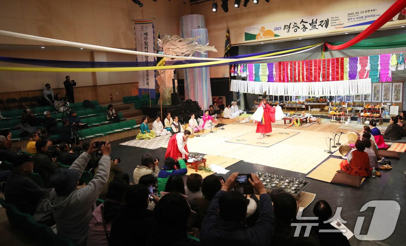 13일 오전 제주시 제주칠머리당영등굿 전수관에서 제주 칠머리당 영등굿 보존회 주관으로 영등 송별대제가 봉행되고 있다. 풍요로운 한해를 비는 송별제는 음력 2월 초하루 제주도에 들어온 영등신을 떠나보내는 제의로, 칠머리당 영등굿은 2009년 유네스코 세계무형유산 대표목록으로 등재됐다. 2025.3.13/뉴스1 ⓒ News1 오현지 기자