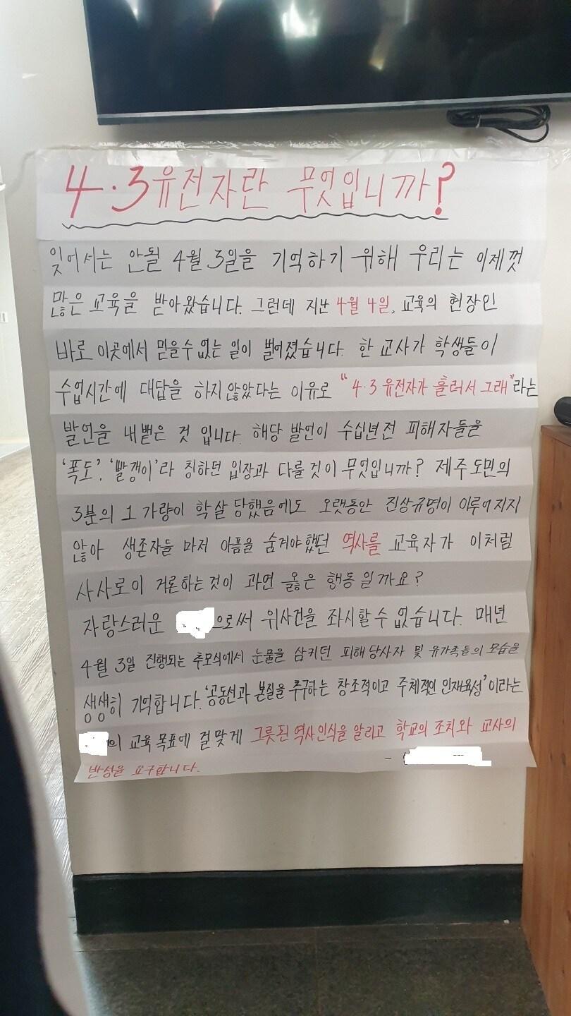 학생 대답하지 않았다는 이유로 '4·3 유전자' 발언…비판 대자보 붙어학교 측 "정확한 경위 파악 위해 해당 교사로부터 사실 확인 진행 중" 제주도내 한 고등학교 교사가 수업 시간에 학생을 상대로 "4·3유전자가 흐른다"는 발언, 논란이 일고 있다. 11일 해당 학교에 내걸린 대자보.(독자 제공, 재판매 및 DB 금지)/뉴스1강승남 기자 인공지능·디지털 맞춤형 교육…제주교육청, 연구·선도학교 50곳 선정"카지노 게임 조작" 제주 카지노서 폭행한 중국인 3명 집유 구형