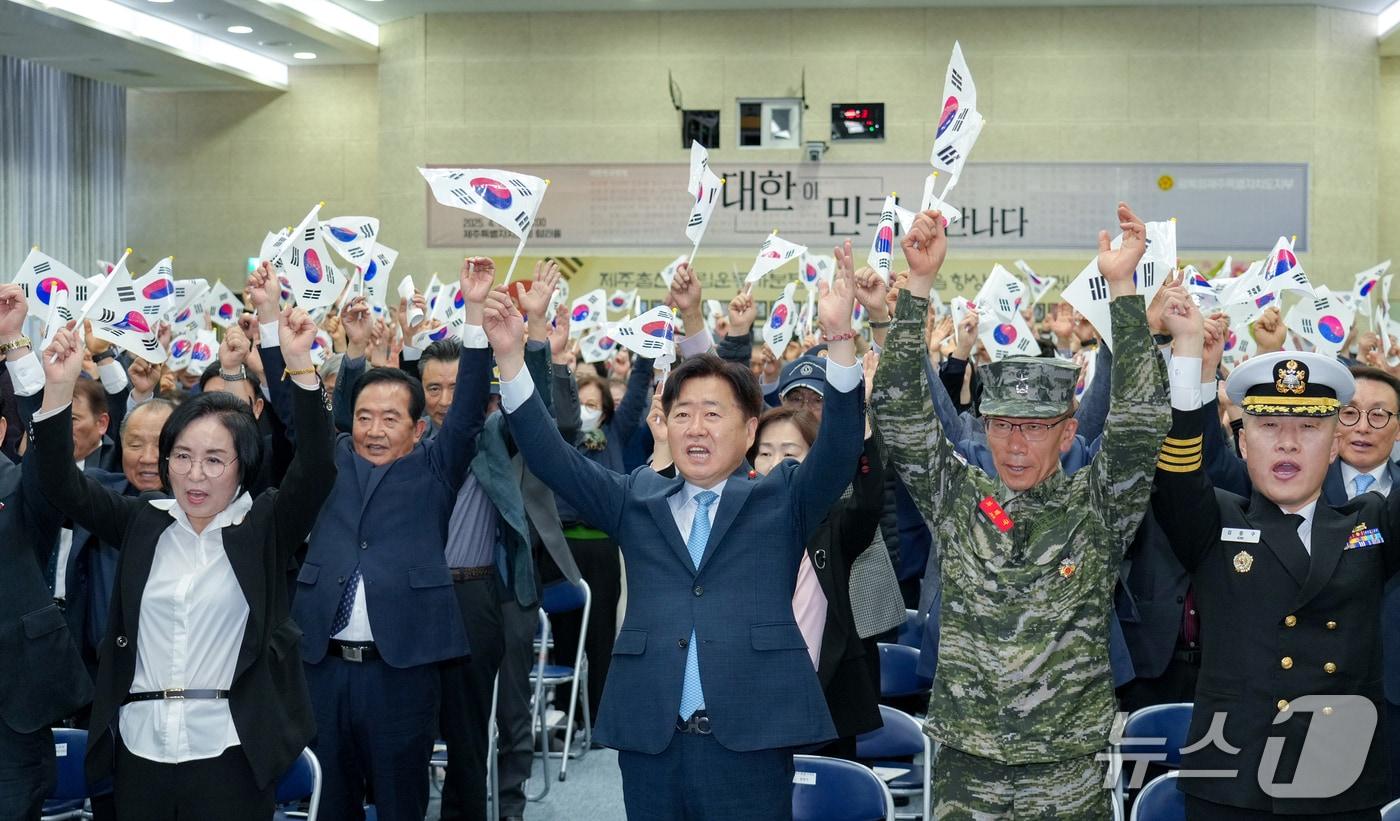 11일 제주도청에서 열린 '제106주년 대한민국임시정부수립 기념식' 참가자들이 만세를 외치고 있다(제주도 제공.재판매 및 DB금지)/뉴스1
