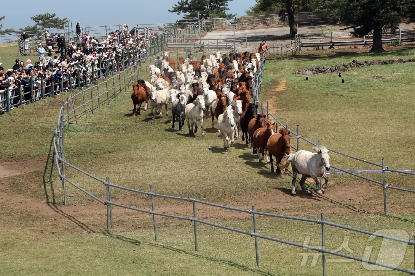 19일 제주시 제주마방목지에서 방목된 천연기념물 제주마 100여 마리를 보고 있는 사람들. 이곳에서는 오는 20일까지 '2025 제주마 입목 문화축제 347 페스티벌'이 열린다.2025.4.19/뉴스1 ⓒ News1 홍수영 기자