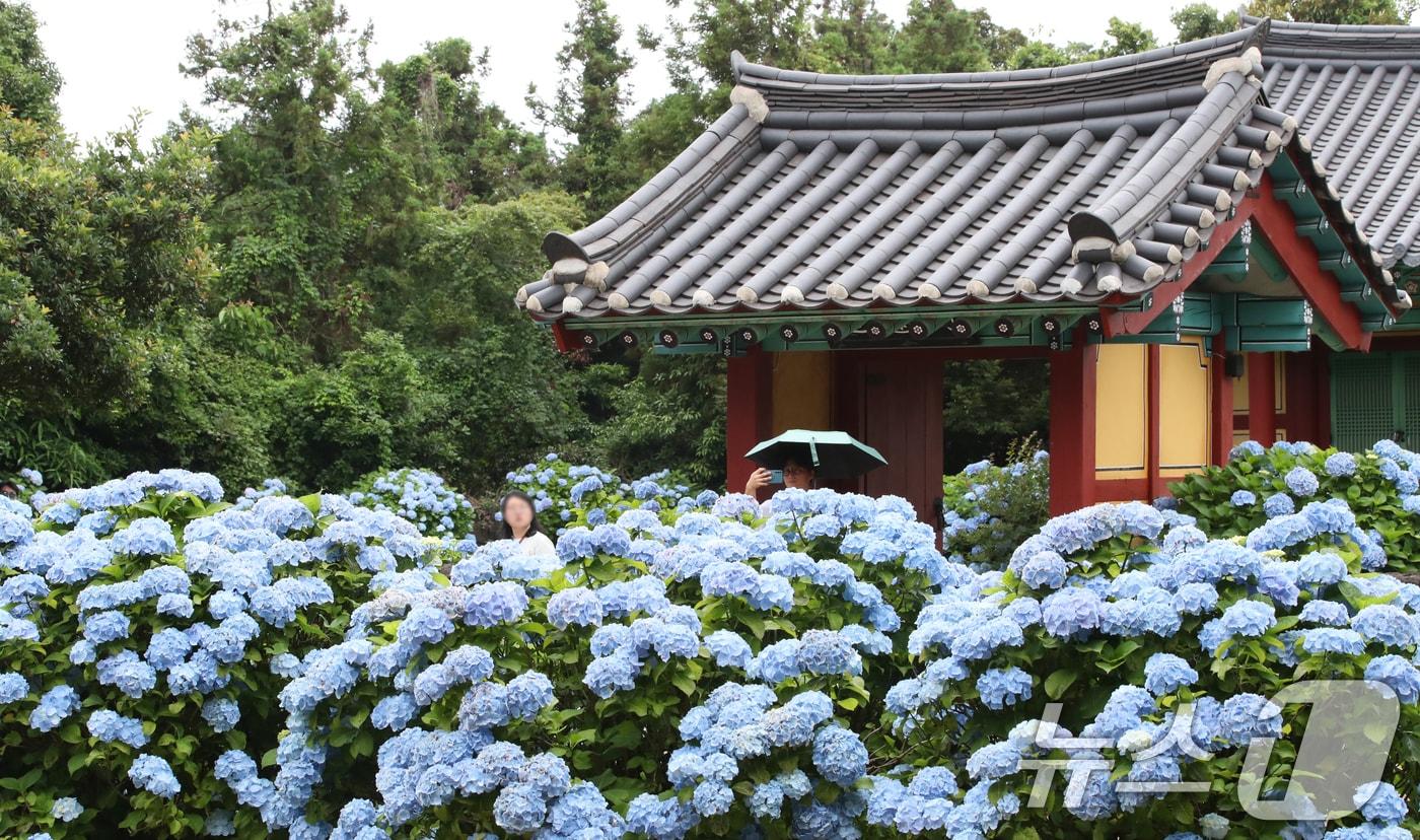 15일 오후 수국이 만개한 제주 서귀포시 성산읍 혼인지에서 관광객들이 사진을 찍으며 추억을 남기고 있다. 2025.6.15/뉴스1 ⓒ News1 오현지 기자