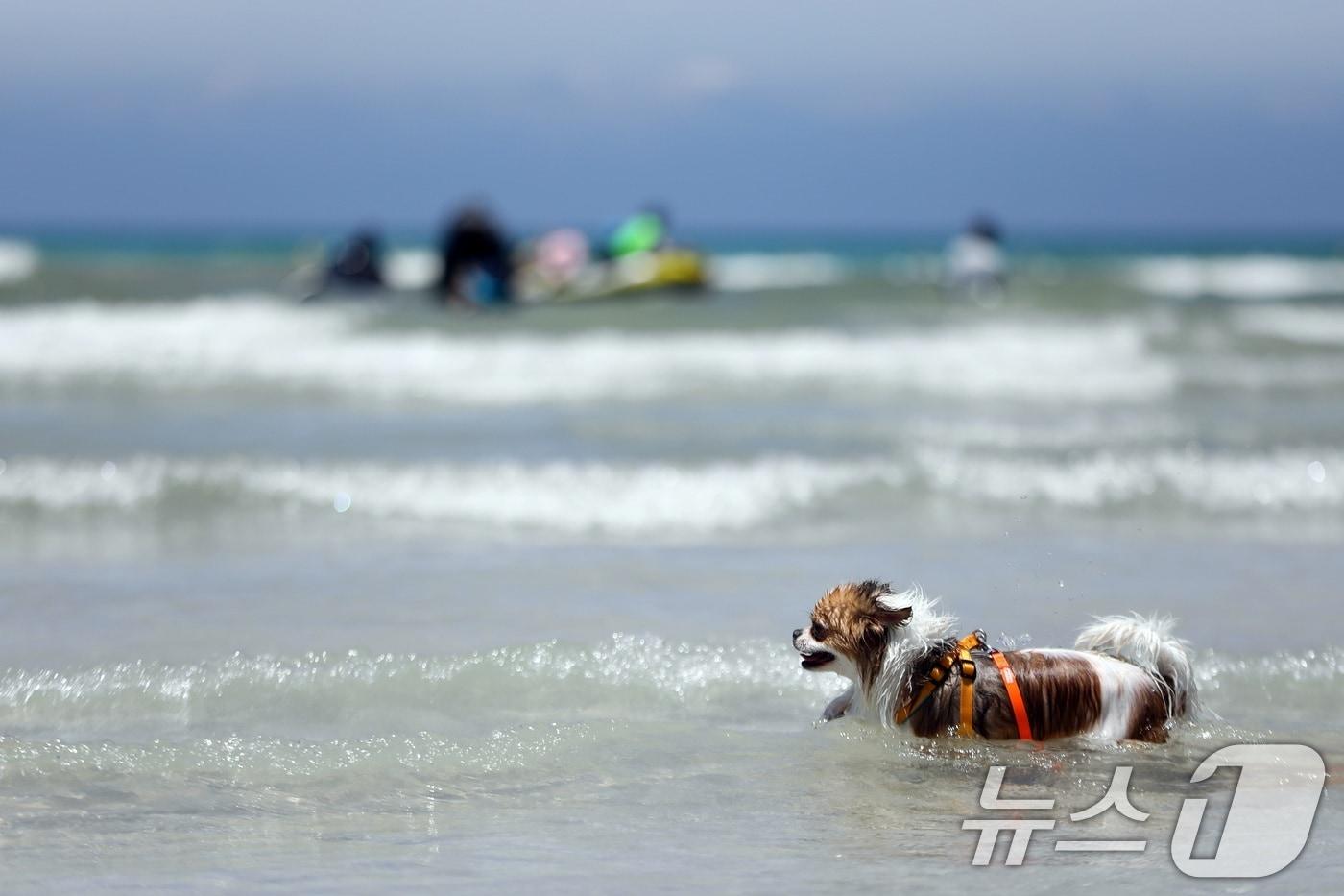 전국에 폭염특보가 발효된 6일 오후 제주시 함덕해수욕장 내 반려견 동반 해변인 '함도그비치'에서 반려견들이 물놀이를 하고 있다.2025.7.6/뉴스1 ⓒ News1 고동명 기자
