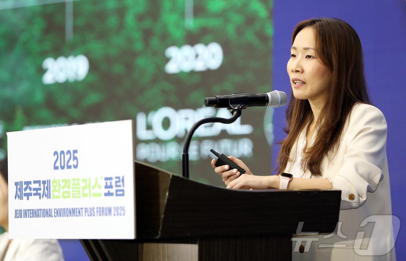 소지혜 로레알 코리아 그룹홍보실 및 지속가능성 부문장이 17일 오후 제주국제컨벤션센터 한라홀에서 열린 '2025 제주국제환경플러스포럼' 기업 세션에서 '미래를 위한 로레알'을 주제로 발표하고 있다. 2025.7.17/뉴스1 ⓒ News1 오미란 기자