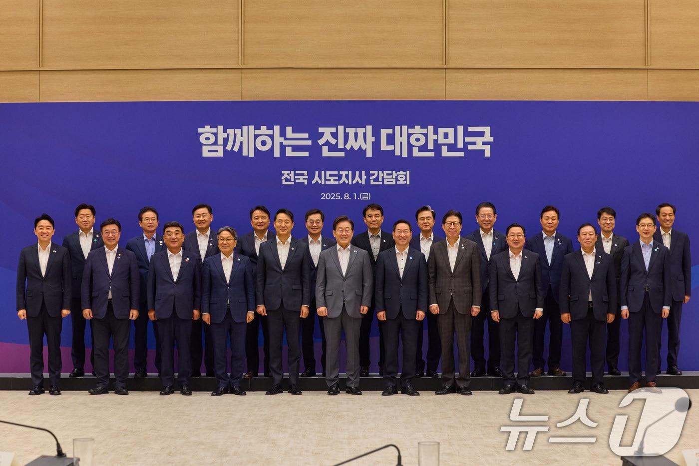 이재명 대통령이 1일 서울 용산 대통령실 청사에서 열린 전국 시·도지사 간담회에서 기념촬영을 하고 있다. (대통령실 제공. 재판매 및 DB금지) 2025.8.1/뉴스1 ⓒ News1 이재명 기자