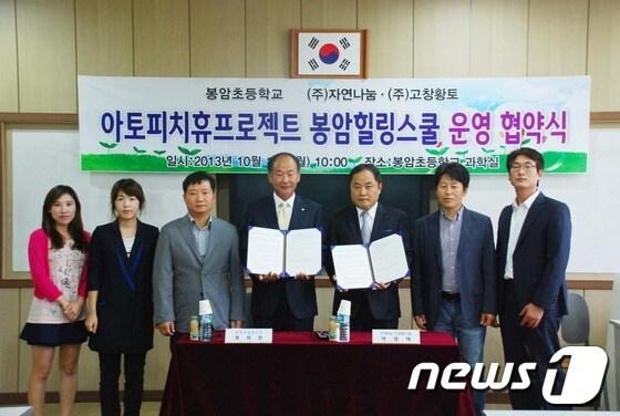 ㈜자연나눔-㈜고창황토 박영택 대표 5억 지원 약속전북 고창군 부안면 봉암초등학교(교장 최석진)가 지역 독지가인 ㈜자연나눔-㈜고창황토 박영택 대표이사의 도움으로 아토피치유 전문학교로 거듭난다. 왼쪽 네번째 최석진 교장, 다섯번째 박영택 대표.ews1 © News1