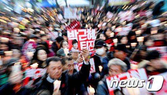 3일 전북 전주시 고사동 객사 앞에서 열린 박근혜 즉각 퇴진을 위한 제4차 전북도민 총궐기에서 도민 1만 8000여 명(주최 측 추산, 오후 7시 기준)이 몰려 박근혜 정권 즉각 퇴진을 외치며 세이브존에서 풍남문 광장까지 행진을 벌이고 있다.2016.12.3/뉴스1 ⓒ News1 박아론 기자