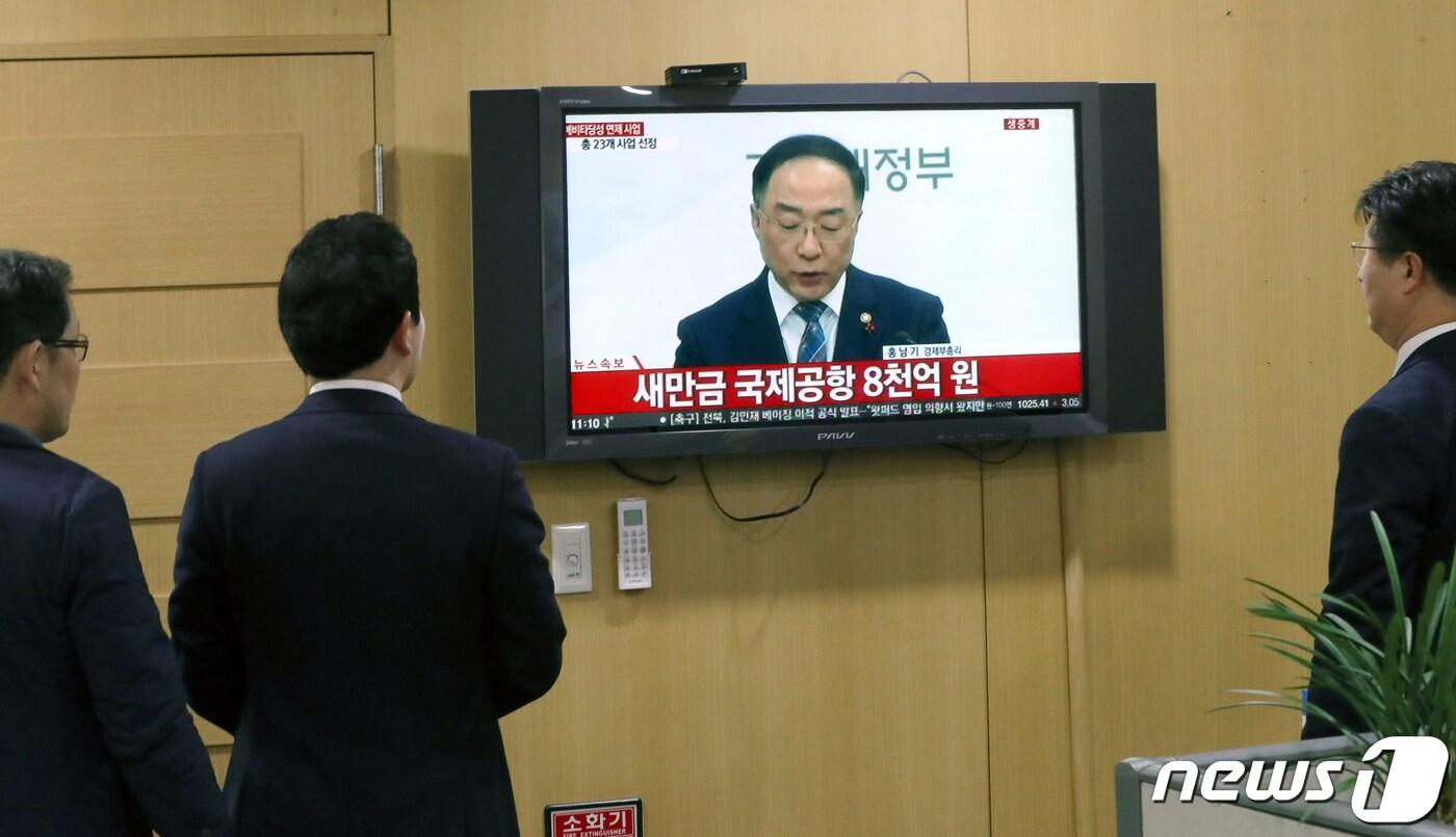 정부의 국가균형발전을 위한 예비타당성조사(예타) 면제 발표가 이뤄진 29일 전북 전주시 전북도청에서 직원들이 홍남기 경제부총리 겸 기획재정부 장관의 발표 중계를 보고 있다.2019.1.29/뉴스1 ⓒ News1 문요한 기자