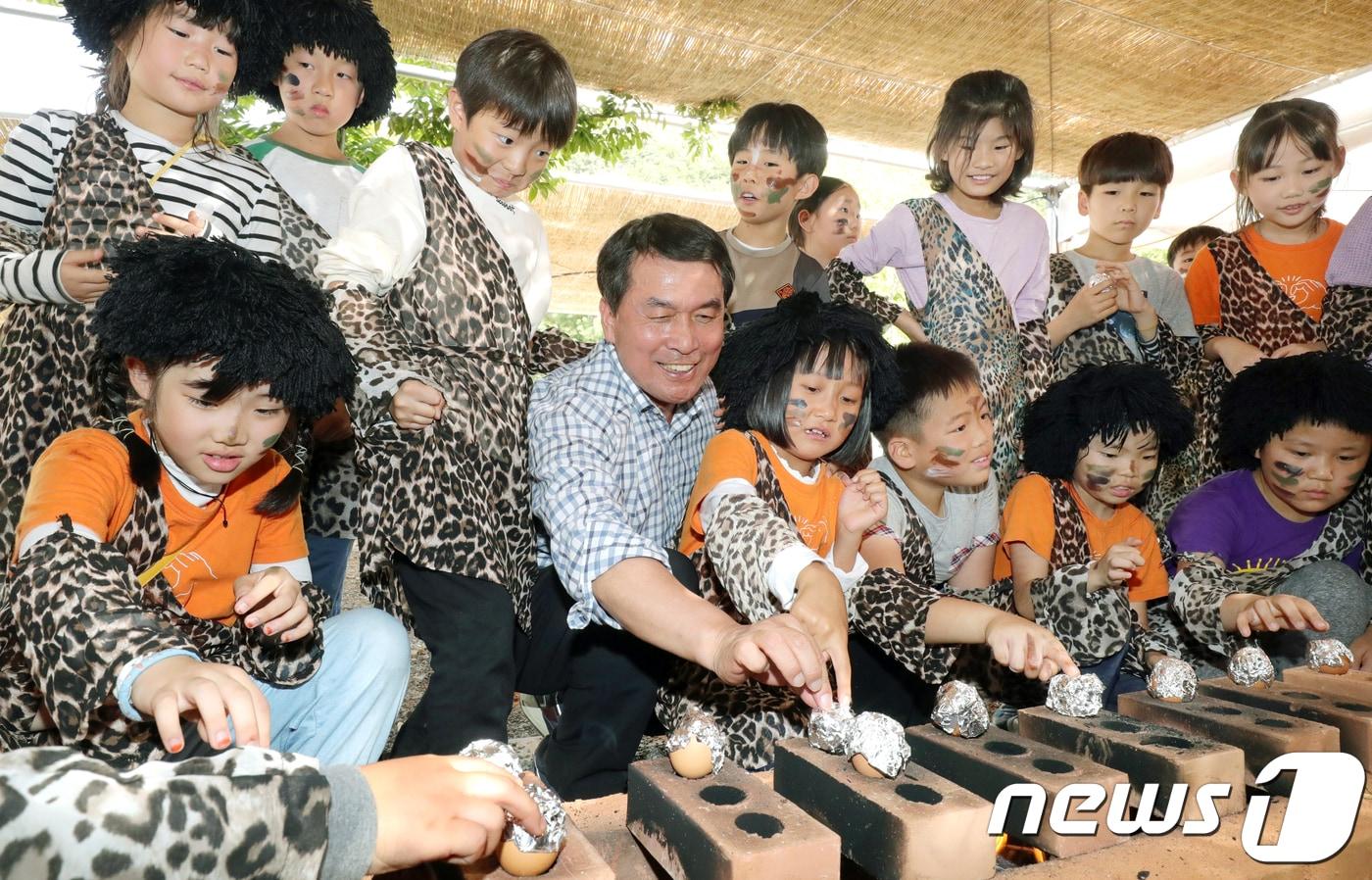 지난 2018년 전북 완주군 고산자연휴양림 일원에 마련된 축제장에서 박성일 완주군수와 사전체험을 나온 용봉초등학교 2학년 어린이들이 계란밥을 만들어보고 있다. /뉴스1