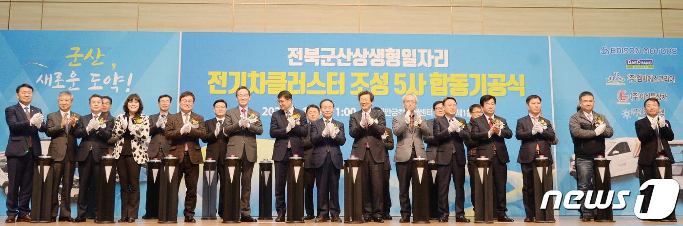 16일 전북 군산시 새만금컨벤션센터에서 열린 '전북 군산 상생형 일자리 전기차클러스터 조성 기공식'에서 송하진 전북도지사를 비롯한 ㈜에디슨모터스, ㈜대창모터스, ㈜엠피에스코리아, ㈜코스텍, ㈜이삭특장차 등 5개사 관계자들이 기념촬영을 하고 있다. 2020.1.16 /뉴스1 유경석 기자