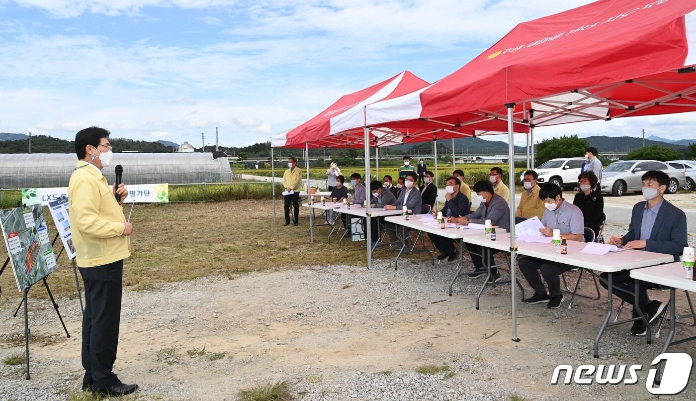 이환주 남원시장이 23일 (구)주생비행장 부지에서 진행된 'LX드론활용센터 구축사업' 현장 브리핑에 참석해 남원시의 장점을 소개하고 있다.(남원시 제공)2020.9.24/ⓒ 뉴스1