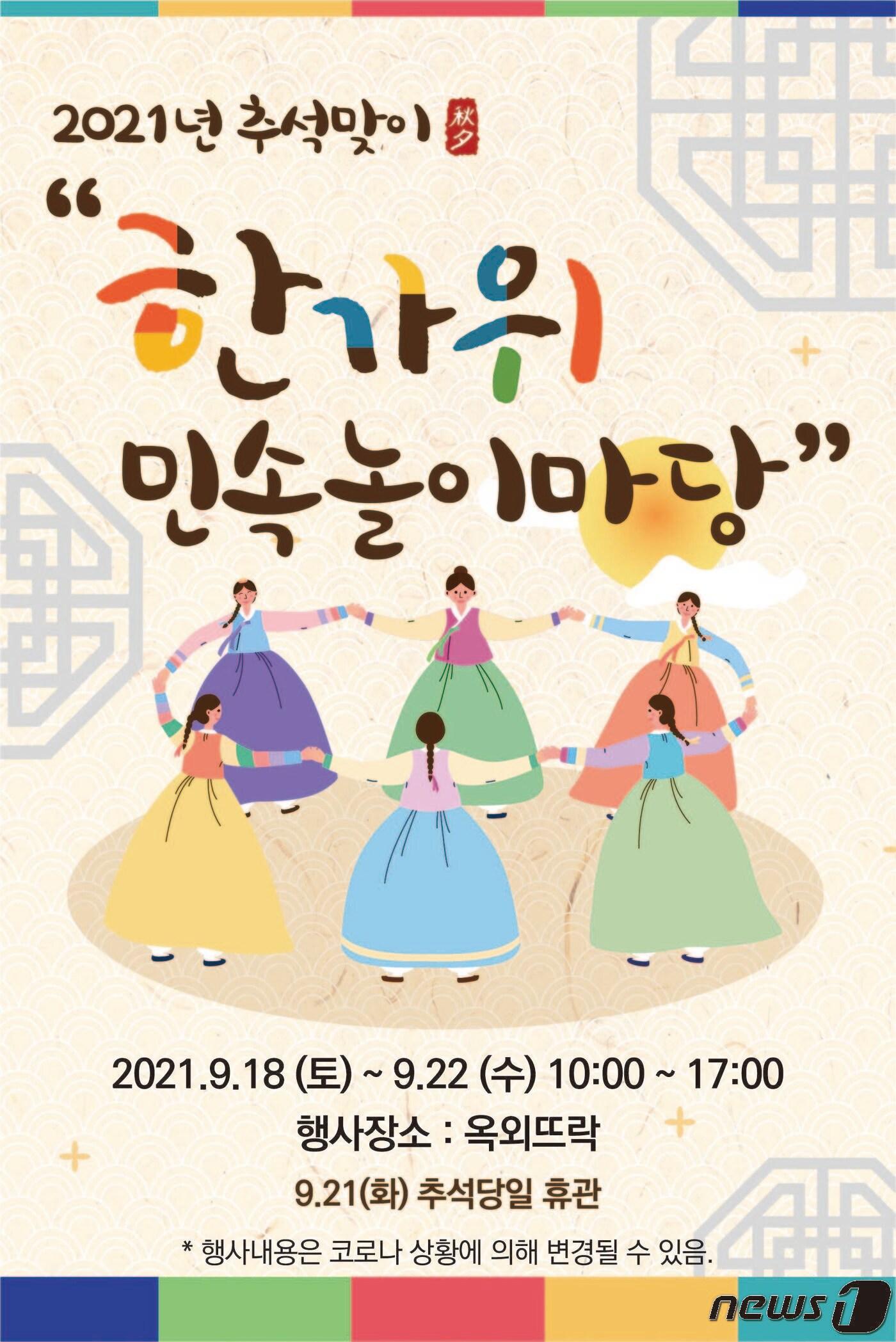 추석 당일 휴관…어린이박물관 사전예약 입장용담댐 20주년 특별전 '용담, 새로이 기억하다'국립전주박물관은 민족 대명절인 한가위를 맞이해 오는 18일부터 22일까지 '한가위 전통민속놀이 한마당'을 진행한다고 17일 밝혔다.(국립전주박물관 제공)2021.9.17/ⓒ 뉴스1