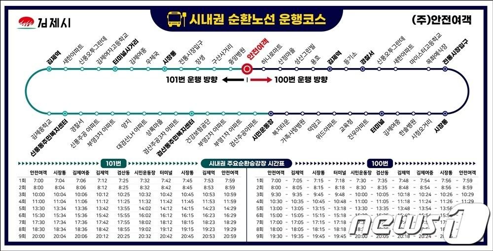 100번 오전 7시~오후 7시30분, 101번 오전 7시~오후 8시까지 운행안전여객 차고지~하나로마트~김제역~터미널~시민운동장 등 노선김제 시내버스 100번·101번 시내권 순환형 버스노선도.ⓒ 뉴스1관련 키워드김제시순환형시내버스시내버스안전여객김재수 기자 김제시, 인구 증가 힘입어 올해 '정주·생활인구' 연계 정책 추진김제시, 2029년부터 금구면에 도시가스 공급…주민숙원 해결