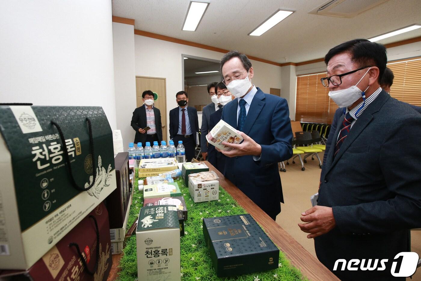 송하진 전북지사가 12일 국내 천마 생산량의 67%를 차지하고 있는 무주 천마클러스터 현장을 방문해 여환호 무주 천마사업단장으로부터 천마클러스터 주요 현안을 청취한 후 천마 제품 생산 현장을 둘러보고 있다(전북도 제공)2022.5.12/.ⓒ 뉴스1유승훈 기자 전북도 감사 행정, 전국 최고 평가…2년 연속 최우수전북서 'AI시대 바람직한 미래도시 조성 방안' 모색 컨퍼런스 열려