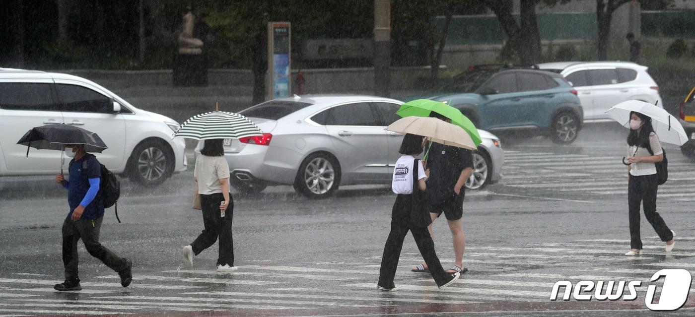 소나기가 내린 2일 전북 전주시 백제대로에서 우산을 쓴 시민들이 발걸음을 옮기고 있다. 2021.8.2/뉴스1 ⓒ News1 유경석 기자