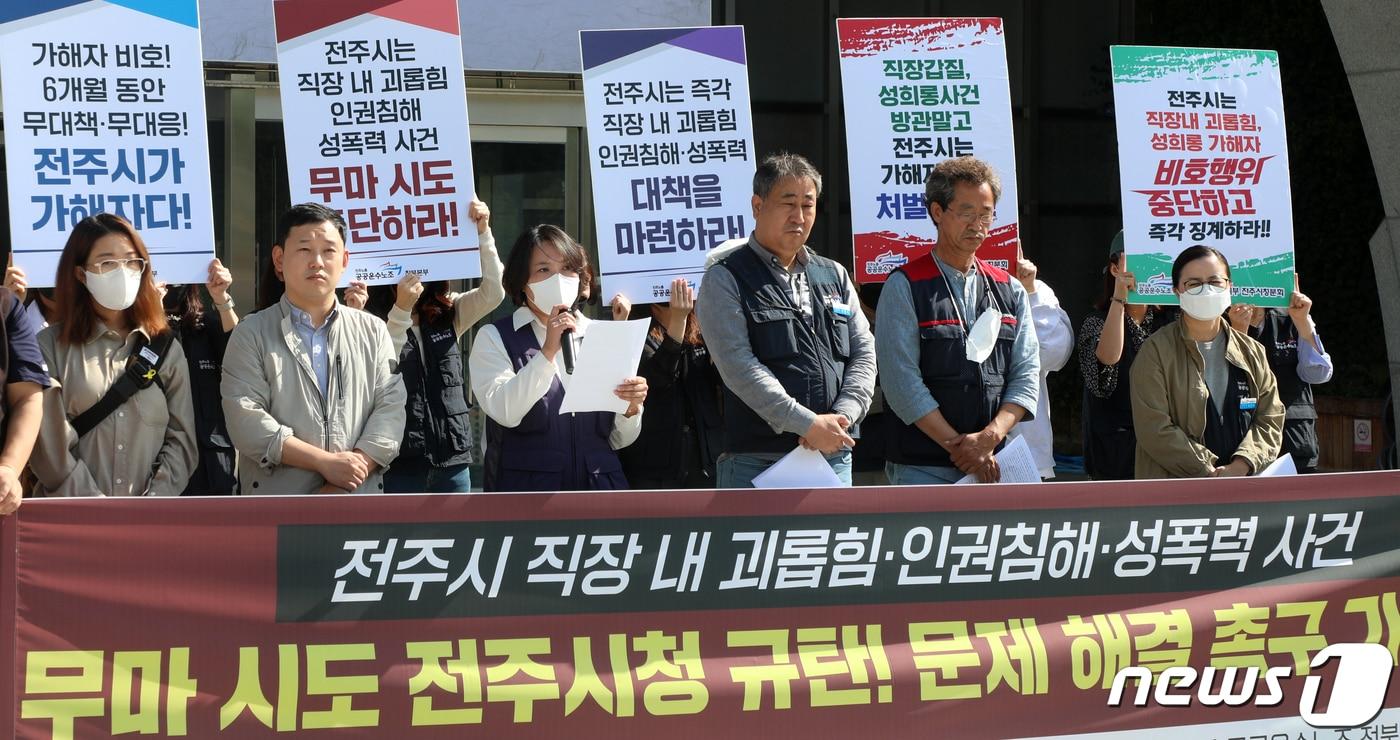 민노총 공공운수노조, “전주시 인권위, 가해자 주장만 받아들여”전주시 “업무상 적정범위를 넘어서지는 않은 것으로 확인”공공운수노조 전북본부 관계자들이 27일 전북 전주시 전주시청 앞에서 '전주시 직장 내 괴롭힘·인권침해·성폭력 사건' 문제 해결 촉구 기자회견을 하고 있다. 2022.9.27/뉴스1 ⓒ News1 유경석 기자임충식 기자 전주 배 올해 첫 수출길…베트남 전역에 공급전주야구장·실내체육관 2027년 준공…우범기 시장 "속도 낼 것"