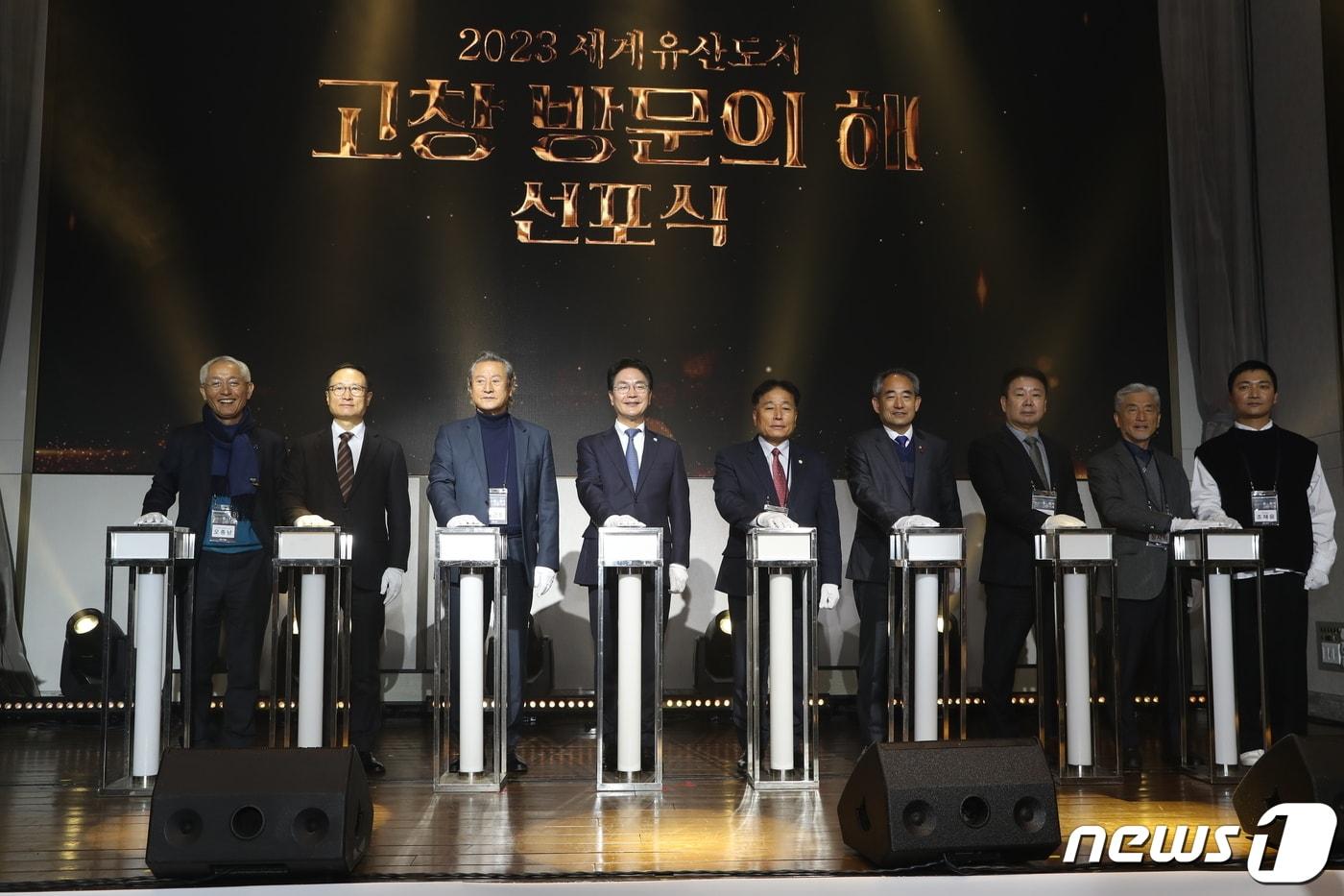 오종남 교수 등 지역출신 인사와 연예인 친선·홍보대사 위촉1년 내내 축제와 관광 이벤트로 1000만 관광객 유치 다짐 전북 고창군은 16일 오전 11시 서울 롯데시그니엘 호텔에서 심덕섭 군수를 비롯해 윤준병 국회의원과 주요 언론사, 국내·외 여행사 관계자, 서포터즈단 등 300여명이 참석한 가운데 ‘2023 고창방문의 해’ 선포식을 개최했다.(고창군 제공)2023.1.16/뉴스1전북 고창군이 2023년을 ‘세계유산도시 고창방문의 해’로 선포하고 국내·외 관광객 1000만명을 유치하기 위해 본격 시동을 걸었다. 왼쪽부터 고창군 홍보 친선대사로 임명된 장사익(소리꾼), 오종남(서울대 명예주임교수), 심덕섭 군수, 박근형(배우)씨.(고창군 제공)2023.1.16/뉴스1 전북 고창군이 2023년을 ‘세계유산도시 고창방문의 해’로 선포하고 국내·외 관광객 1000만명을 유치하기 위해 본격 시동을 걸었다. 왼쪽부터 홍보대사로 임명된 조재윤(배우), 김규리(배우), 심덕섭 군수, 김태연(가수), 김현(가수), 박종원씨(마술사). (고창군 제공) .2023.1.16/뉴스1
