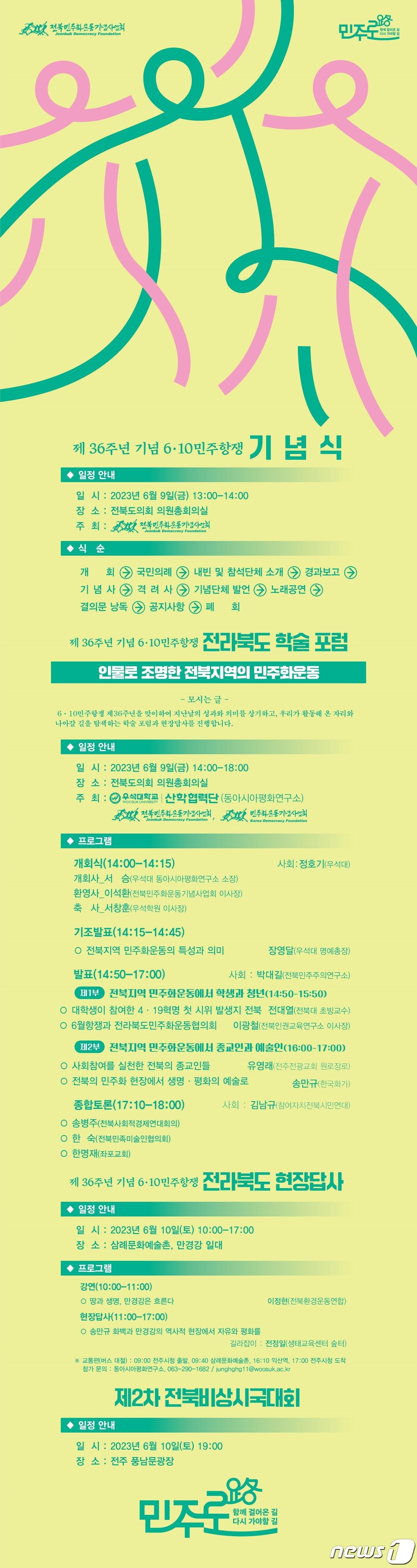9~10일 도의회·만경강 일대서 포럼, 현장답사 등 진행6·10 민주항쟁 36주년을 맞아 민주화운동의 의미를 되새기는 특별한 행사가 전북에서 펼쳐진다./뉴스1관련 키워드6·10 민주항쟁민주화운동관련 기사[뉴스1 PICK]李대통령 '상하이 임정청사 100년 기념식 참석'…"보훈이 외교란 말 실감"李대통령, 시 주석에 "안중근 의사 유해 발굴·사적지 보전 협조 요청"[12·3계엄 1년]李대통령 6개월 '민주 대한민국 복귀'…12·3 기념일 지정 추진조국 "李대통령 올해 만나고파"…우상호 "잘 전달하겠다"(종합)조국, 우 의장에 "지선 때 원포인트 개헌해야"…내일 정청래 회동