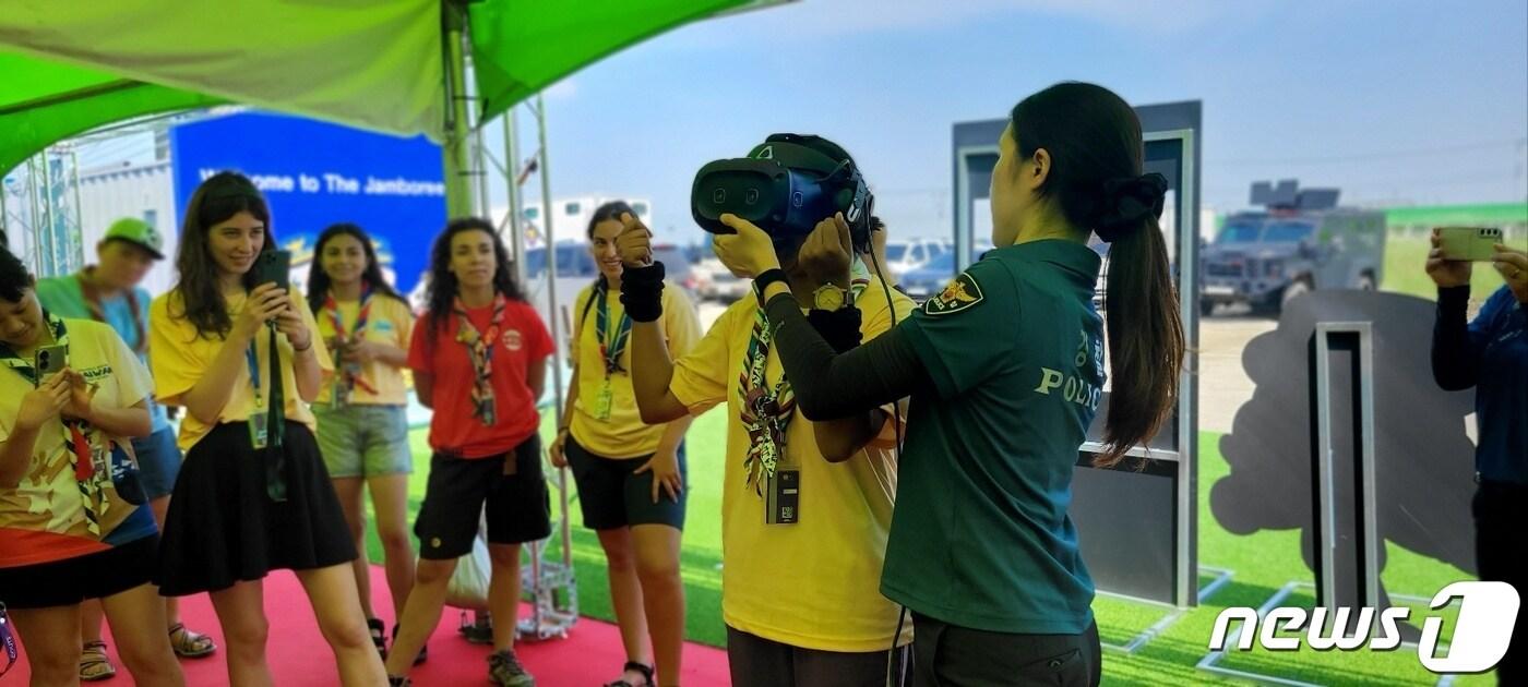 전북경찰, 1~11일 잼버리 영지 내 홍보 체험부스1일 전북 부안군 새만금 세계잼버리대회 잼버리 경찰서 홍보 부스에서 외국인 청소년들이 과학치안 체험 활동을 하고 있다.2023.8.1/뉴스1관련 키워드전북경찰과학치안경찰체험잼버리세계잼버리