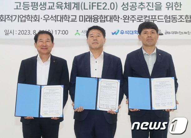 우석대 미래융합대학이 완주로컬푸드협동조합·한국사회적기업학회와 업무협약을 맺고 ‘2주기 대학 평생교육체제 지원사업(LiFE 2.0)’의 성공적인 추진을 위해 힘을 모으기로 했다.(우석대 제공)/뉴스1관련 키워드우석대 미래융합대학완주로컬푸드협동조합한국사회적기업학회임충식 기자 "학생이 사라진다" 초등 입학생 9천명 선 무너진 전북…4년 뒤엔전주 배 올해 첫 수출길…베트남 전역에 공급