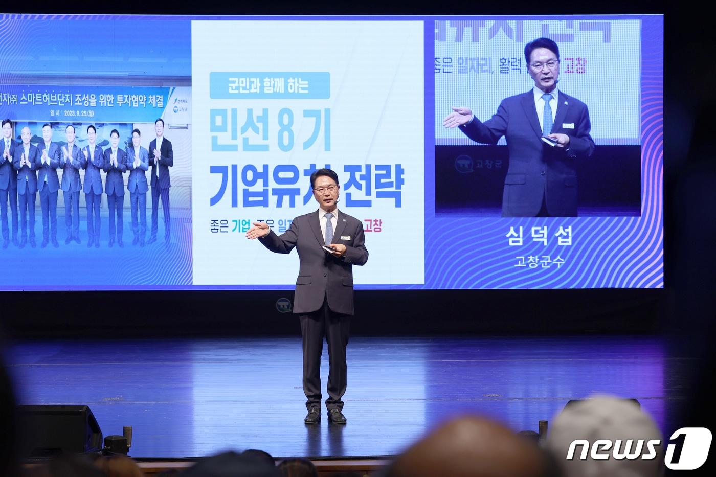 전북 고창군이 30일 고창문화의 전당에서 군민들을 대상으로 삼성전자 등 ‘민선 8기 기업유치 추진상황 설명회’를 개최하고 있다. 심덕섭 군수는 이날 직접 무대에 올라 삼성전자 등 기업유치를 위한 고충, 애로사항 등 뒷이야기들을 전하며 그간의 소회를 밝혔다.(고창군 제공)2023.10.30/뉴스1