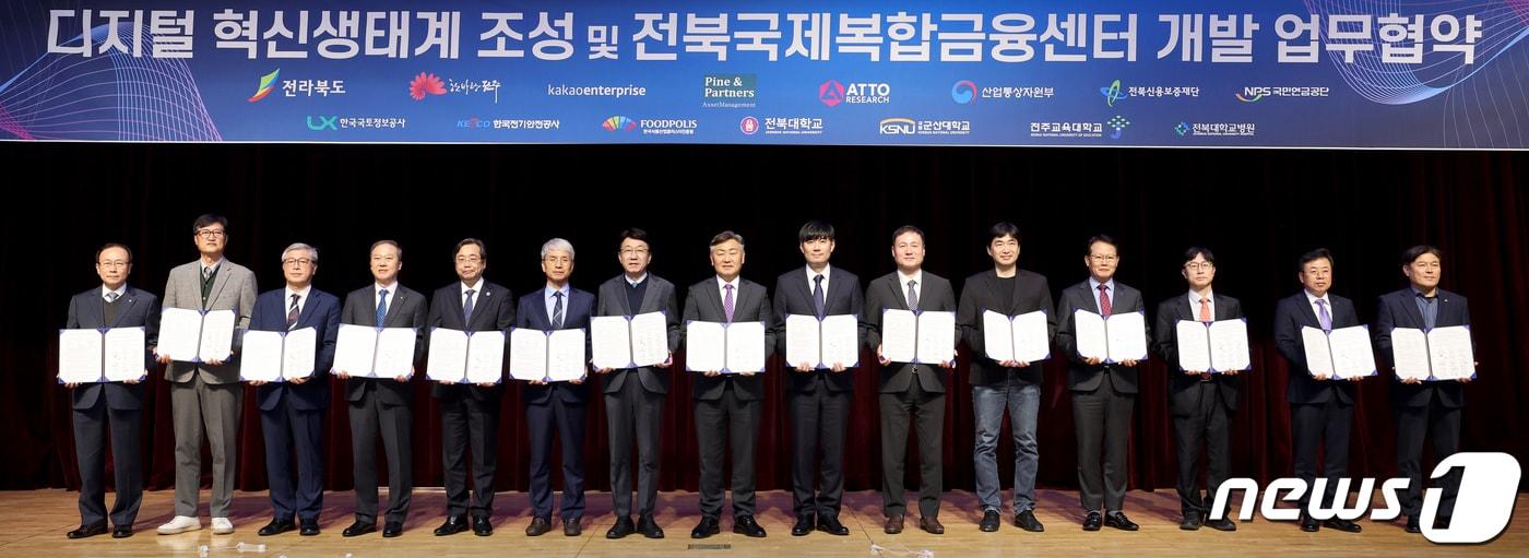 20일 전북도청 대회의실에 김관영 도지사, 우범기 전주시장, 이경진 ㈜카카오엔터프라이즈대표, 정재웅 아토리서치㈜대표, 김창호파인앤파트너스자산운용㈜대표 등 15개의 관계기관이 참석한 가운데 디지털 혁신생태계 조성 및 전북국제복합금융센터 개발 업무협약을 체결하고 기념촬영을 하고 있다.2023.11.20.(전북도 제공)/뉴스1