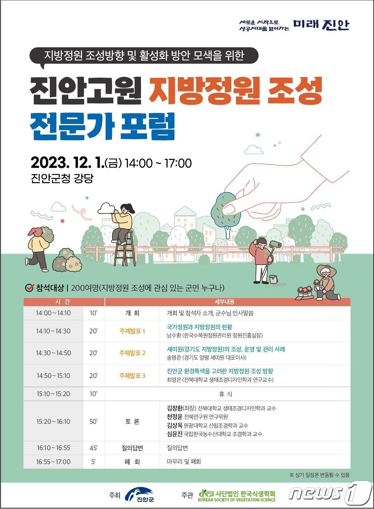 전북 진안군이 오는 12월1일 군청 강당에서 '진안고원 지방정원 조성 전문가 포럼'을 개최한다.(진안군제공)2023.11.26/뉴스1관련 키워드지방정원포럼김동규 기자 '치유도시·치유거리 진안' 주제 AI 쇼츠영상 콘테스트임실군, 관촌면 시작으로 '찾아가는 이동건강검진' 실시관련 기사[오늘의 국회일정] (12일, 금)"계엄 명백히 잘못"…주호영·윤한홍 등 영남 중진 잇단 쓴소리[오늘의 주요일정] 충북·세종(24일, 월)송인헌 괴산군수, 충북 산림환경대상 자치부문 대상 수상[오늘의 주요일정] 경기(17일, 월)
