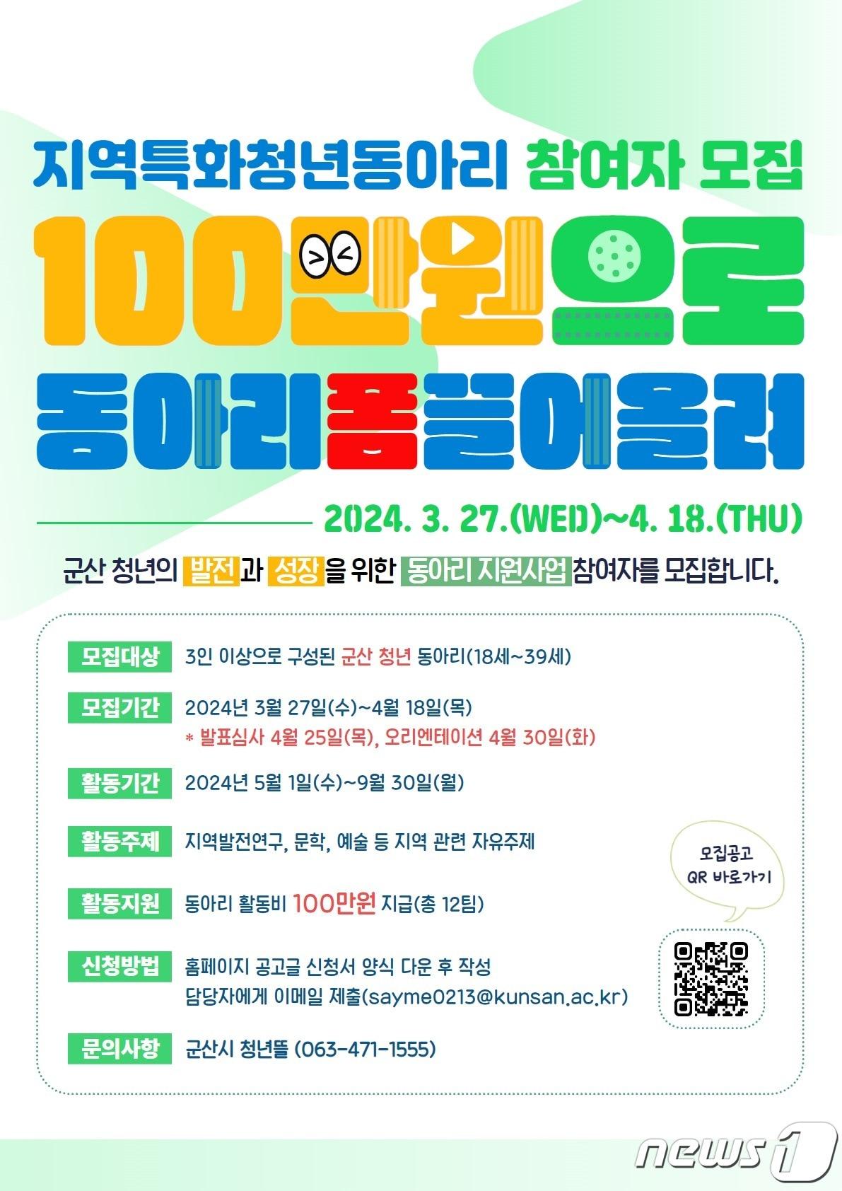 청년 3인 이상 구성된 동아리, 18일까지 접수전북자치도 군산시가 청년뜰 지역특화사업으로 청년 3인 이상 구성된 동아리에 활동비를 지원한다.2024.4.4/뉴스1관련 키워드청년군산시지역특화청년동아리활동비김재수 기자 김제시의회·시민연대 "새만금신항 기본계획 유지하라"국립군산대 18년 연속 등록금 동결…4년제 일반대학 중 최저 수준관련 기사나종대 군산시장 출마예정자, '스포츠산업 전환' 비전 발표군산시 월명동 일원, 중기부 '동네상권발전소' 지원사업 선정전북사회서비스원 청년미래센터, 취약 청년 심리상담 지원군산 '술익는 마을'로 특화…오영주 "골몰상권에 세계인 오도록"전북, 12년 만에 출생아 수 반등…9개 시·군 출생아 수↑