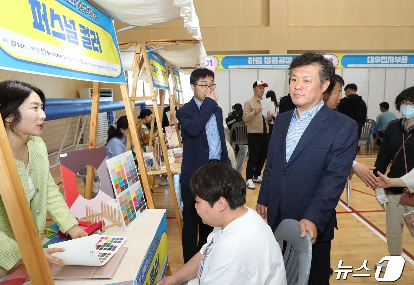 이학수 정읍시장이 25일 장애인 취업박람회 현장을 방문하고 참가자들을 격려하고 있다.(정읍시 제공)2024.4.25/뉴스1