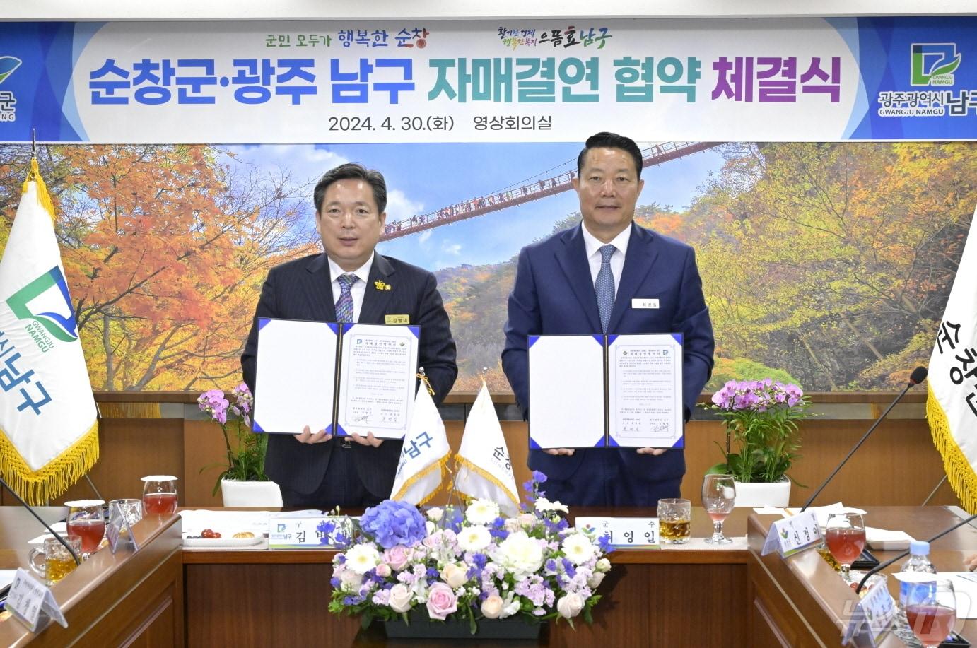 “상호 장점 공유, 단점 보완 통해 지속적 동반 성장·발전 기대”30일 전북자치도 순창군청에서 열린 '순창군-광주 남구 자매결연 협약 체결식' 모습. 최영일 순창군수(오른쪽)과 김병내 광주 남구청장(왼쪽)이 기념 촬영을 하고 있다.2024.4.30.(순창군 제공)/뉴스1 유승훈 기자 '2년 연속 불발' 김관영 전북지사 완주군 방문, 이번엔 성사되나[오늘의 날씨] 전북(17일, 토)…구름 많다가 오전부터 맑아져