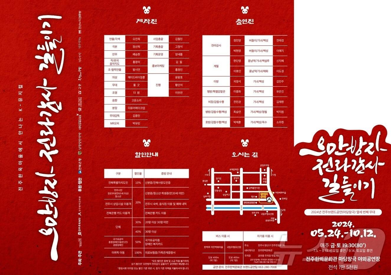 전주시가 주최하고 전주문화재단 전주한벽문화관이 주관하는 전주브랜드공연 '오만방자 전라감사 길들이기'가 오는 24일 성대한 막을 올린다.(전주한벽문화관 제공)관련 키워드전주문화재단전주한벽문화관전주 공연장수인 기자 2층 주택서 떨어진 유리문…군인이 몸 던져 행인 구하고 부상"사육·가공·유통 생태계 갖춰"…익산시, '치킨벨트 거점 지정' 건의