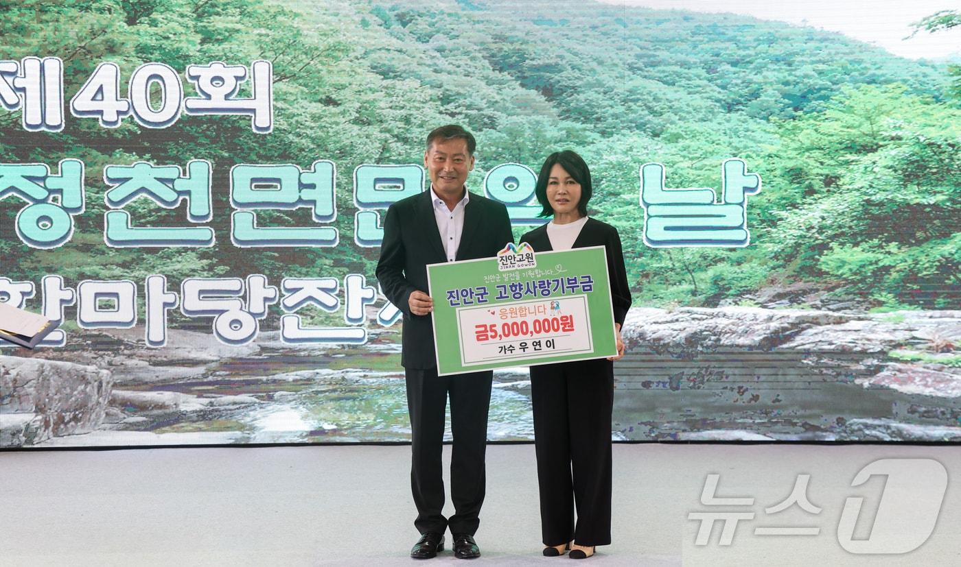 트롯 가수 우연이 씨(오른쪽)가 전춘성 전북 진안군수에게 고향사랑기부금을 전달하고 있다.(진안군 제공)2024.6.10/뉴스1관련 키워드우연이고향사랑기부금김동규 기자 "촘촘한 노인복지 정책 협력"…김관영 전북지사, 임실군 방문진안군, 농업창업·주택지원 대상자 모집…연 2% 대출 금리