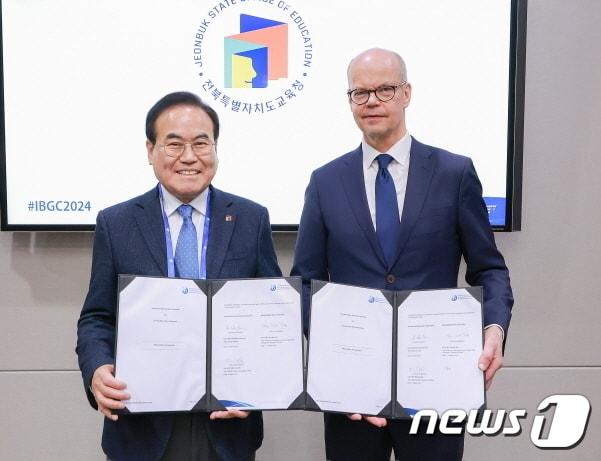 서거석 전북교육감이 지난 2월 21일 대구에서 열린 ‘IB 글로벌 콘퍼런스’에 참석, 올리페카 하이너넨 IBO(국제 바칼로레아 본부) 사무총장과 IB 도입을 위한 협력각서를 체결했다.(전북교육청 제공)/뉴스1관련 키워드전북교육청IB 관심학교 추가지정임충식 기자 "주차 숨통" 전주 서부신시가지 유휴부지에 임시주차장 조성전북교육감 출마 예정자들 일제히 천호성 '표절 논란' 비판(종합)
