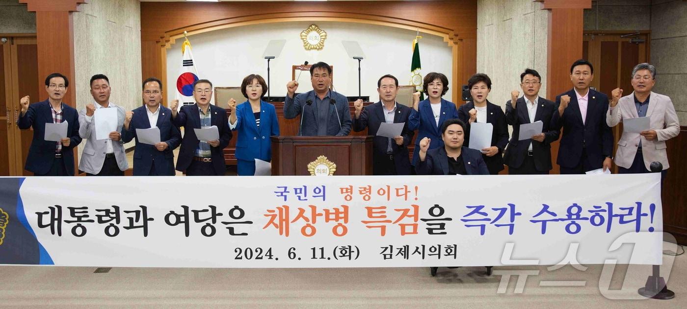 제279회 1차 정례회 결의안 채택김제시의회가 11일 열린 제279회 1차 정례회에서 '채상병 특검법 수용 촉구 결의안'을 만장일치로 채택했다.(김제시의회 제공) 2024.6.11/뉴스1관련 키워드김제시의회채상병특검대툥령여당결의안주상현김재수 기자 김제시의회·시민연대 "새만금신항 기본계획 유지하라"국립군산대 18년 연속 등록금 동결…4년제 일반대학 중 최저 수준